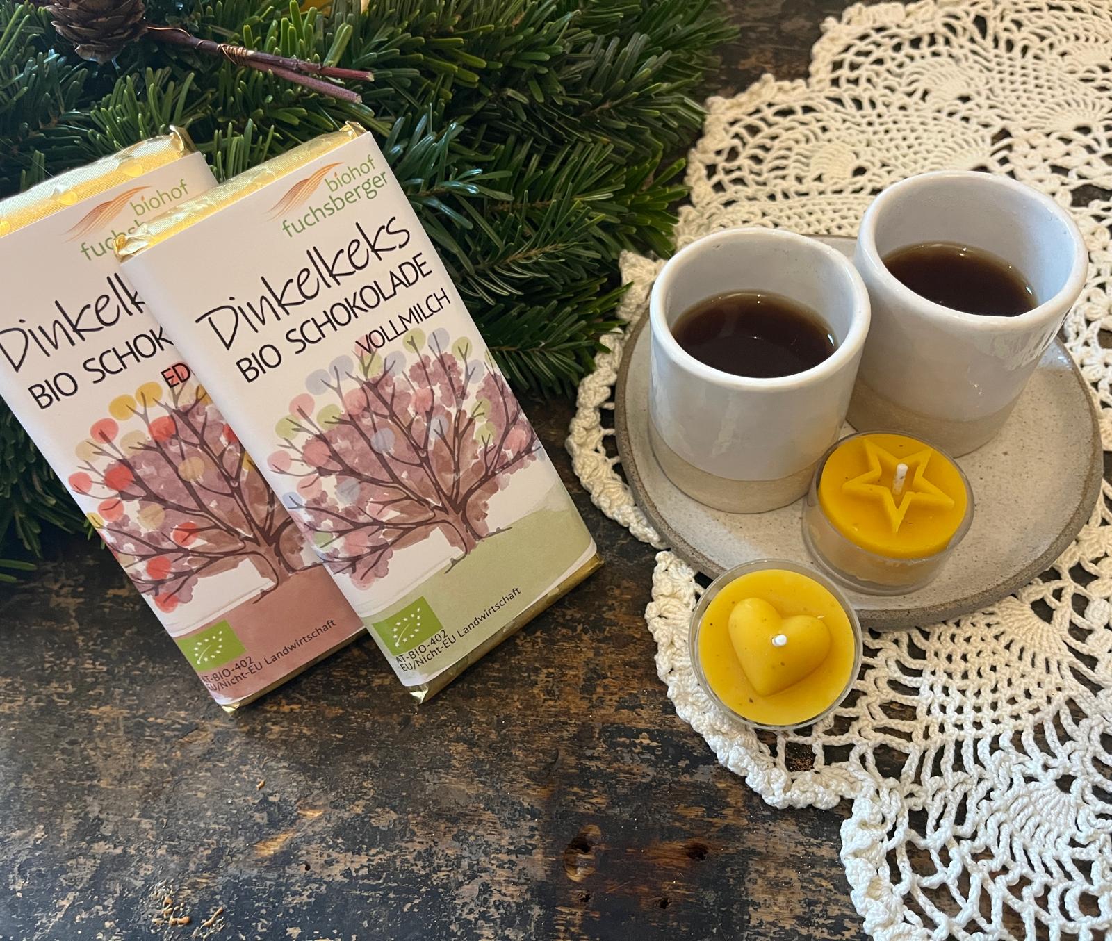 Deswegen gibt es heuer auch Bienenwachskerzen für Adventkränze oder einfach nur ein Teelicht für das gemütliche Wochenende mit einer Tasse Kaffee und Dinkelkeksen oder unserer neuen Dinkelkeks-Schokolade.